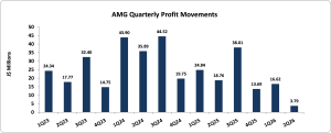 AMG Packaging & Paper Company Limited (AMG) for the six months ended February 28, 2026, reported a 17% decrease in Revenue totalling $414.59 million compared to $500.95 million in the corresponding period last year. Revenue for the second quarter had a 23% decrease to close at $190.84 million compared to $248.32 million for the comparable quarter of 2025.