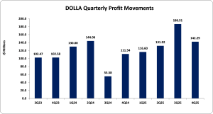 Dolla Financial Services Limited (Dolla), for the twelve months ended December 31, 2025, reported a 29% increase in total interest income, amounting to $1.97 billion, compared to $1.52 billion recorded for the corresponding period in 2024. For the fourth quarter, total interest income grew by 9%, closing at $477.46 million relative to $437.55 million reported in Q4 2024.