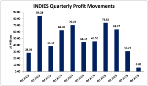 Indies Pharma Jamaica Limited (INDIES), for the twelve months ended October 31, 2025, reported a 3% decrease in revenue, totalling $1.13 billion, compared to $1.16 billion in the corresponding period last year. This decline was primarily due to late arrivals of out-of-stock items caused by government platform software issues and disruptions from Hurricane Melissa during the peak sales period in October. Revenue for the fourth quarter fell by 7%, closing at $271.54 million, versus $291.73 million for the comparable quarter of 2024.