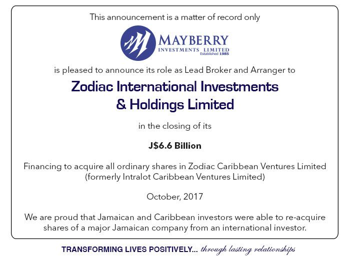 Mayberry Investments Limited acts as lead broker and arranger to Zodiac International Investments & Holdings Limited