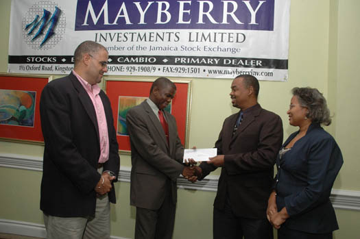 (L-R) Keith Duncan Chairman of National Youth Service (NYS), Rev. Adinhair Jones Executive Director NYS, Gary Peart CEO Mayberry Investments Ltd., Kayree Berry-Teape Mayberry’s Marketing Manager.