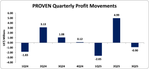 Net Profit Attributable to Shareholders for the nine months amounted to US$1.45 million, a 39% decrease from the US$2.38 million reported in 2024. For the third quarter, Net loss Attributable to Shareholders was US$896,000 (2024: Net profit of US$1.08 million).