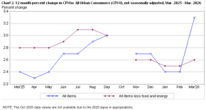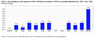 The U.S. Bureau of Labor Statistics reported that the Consumer Price Index for All Urban Consumers (CPI‑U) increased 0.9% on a seasonally adjusted basis in March 2026 — the largest single-month increase since June 2022 — following a 0.3% gain in February. Over the past 12 months, the all items index rose 3.3% before seasonal adjustment, above both the 3.1% market consensus and February’s 2.4% reading.
